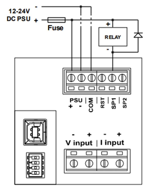 - The (-) of the PSU (12-24V DC only) goes to the "COM" terminal.