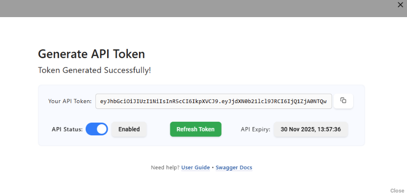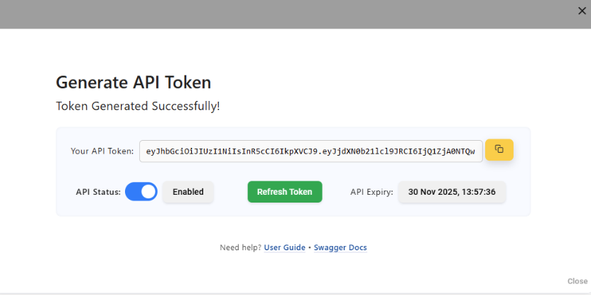 Step 4 – Copy Your Token Click Copy. You’ll use this token in the 'X-Authorization' header as a Bearer token. |